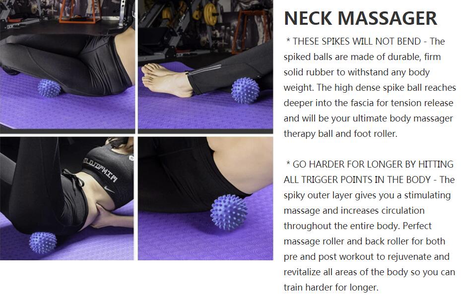 THESE SPIKES WILL NOT BEND - The spiked balls are made of durable, firm solid rubber to withstand any body weight. The high dense spike ball reaches deeper into the fascia for tension release and will be your ultimate body massager therapy ball and foot roller. GO HARDER FOR LONGER BY HITTING ALL TRIGGER POINTS IN THE BODY - The spiky outer layer gives you a stimulating massage and increases circulation throughout the entire body. Perfect massage roller and back roller for both pre and post workout to rejuvenate and revitalize all areas of the body so you can train harder for longer. TAKE WITH YOU TO THE GYM - Small and Compact, this massage ball is perfect for a warm up and cool down routine at the gym, yoga and pilates studios. AND to get you started, we'll email you a FREE downloadable EBOOK with Advanced Massage Techniques to optimize your next workout and blaster muscle recovery fast. ATHLETES AND FITNESS TRAINERS FAVORITE - Recommended by Elite Sport professionals, the porcupine style massaging balls are the perfect portable training equipment for men and women's recovery. Don't forget to pack it with your sport, running and football gear |